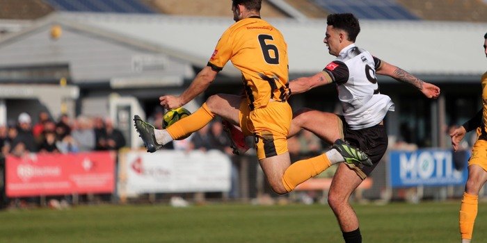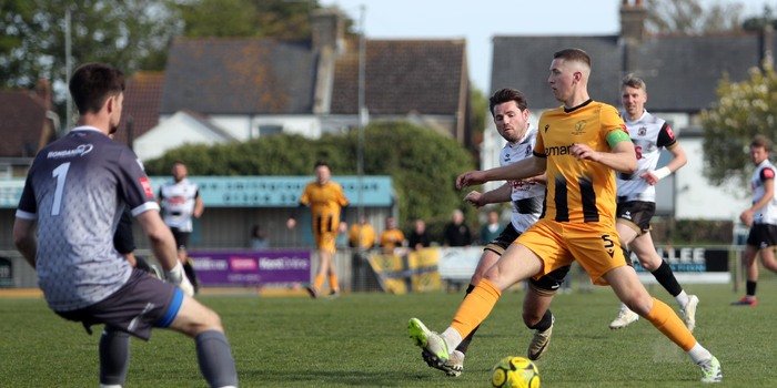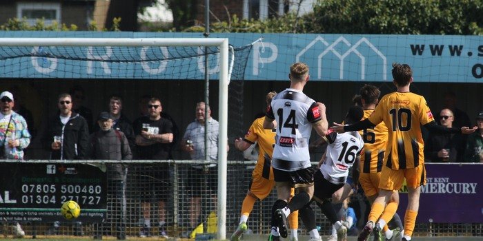 Nicknamed the Wasps, the Sussex visitors didn’t offer much of a sting footballing-wise anywhere after that, but Drew Cooney’s team certainly couldn’t be accused of being afraid to get involved in the physical stuff. With the Deal players determined to stand their ground, the contest gradually developed into a scrappy “slugging match”, with frequent injury stoppages and referee Dave Rowland showing several yellow cards.